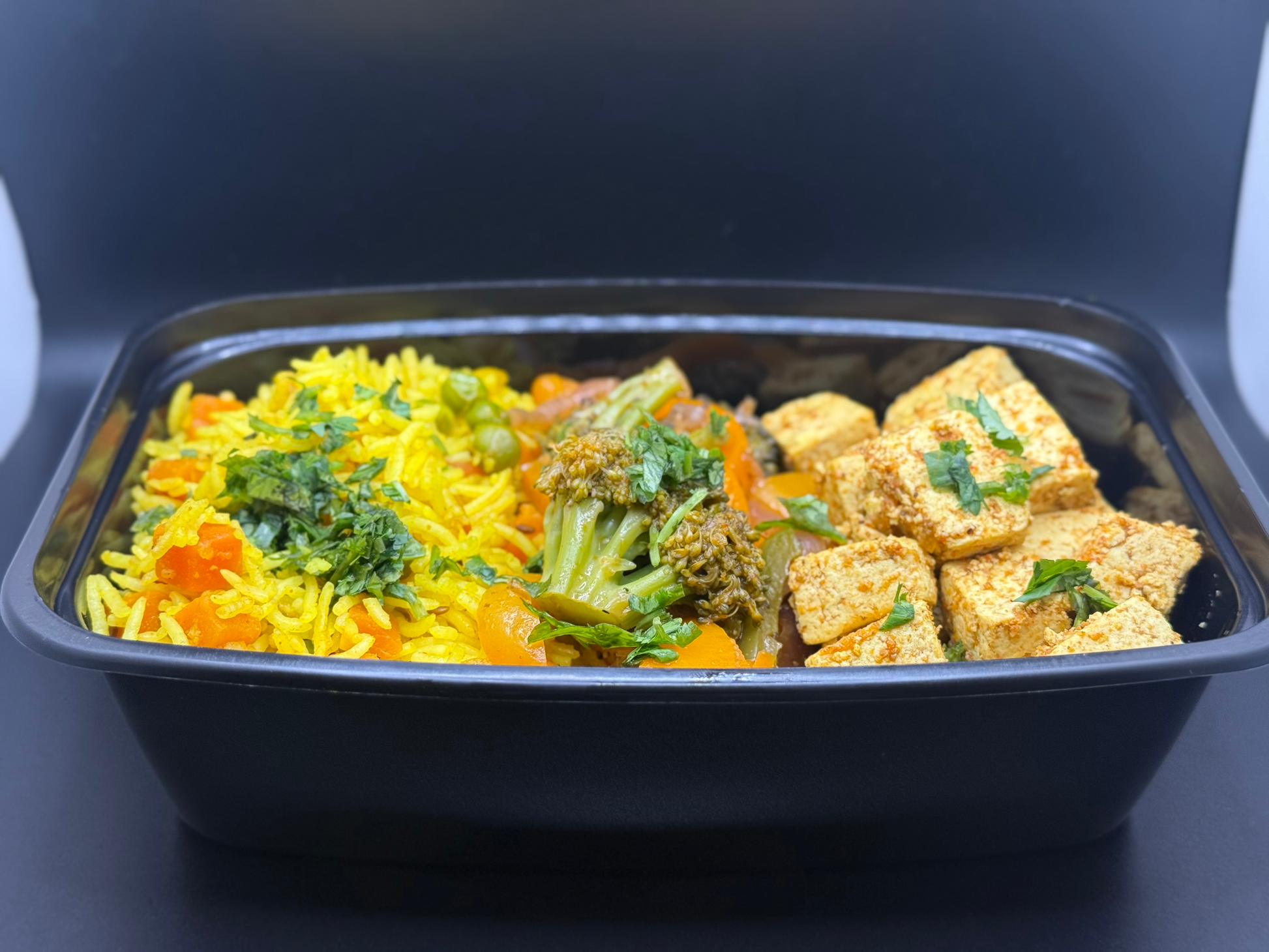 Fragrant Veg Pulao with peas and carrots, served with sautéed fajita-style veggies (broccoli, bell peppers, onions, carrots) and your choice of protein (chicken, paneer, or tofu). Balanced spice, low oil, and clean-label ingredients—made for everyday freshness.